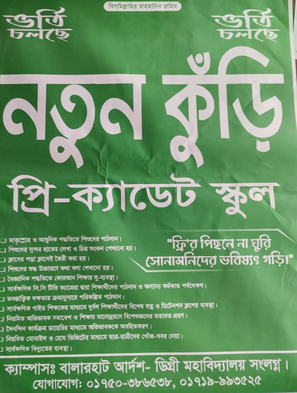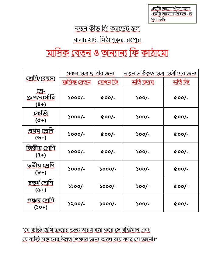বর্তমান বিশ্বের উন্নত দেশসমূহের সাথে তাল মিলিয়ে স্মার্ট বাংলাদেশ বিনির্মাণের স্বপ্নকে বুকে লালন করে আধুনিক ও বিজ্ঞান সম্মতভাবে এলাকার শিশু-কিশোরদের মাঝে শিক্ষার আলো ছড়িয়ে দেওয়ার লক্ষ্য নিয়ে নতুন কুঁড়ি প্রি-ক্যাডেট স্কুল টি প্রতিষ্ঠা করি। এটি একটি ব্যতিক্রমধর্মী ও জবাবদিহিতামূলক ডিজিটাল প্রতিষ্ঠান। এখানে বাংলা, ইংরেজি ও ধর্মীয় শিক্ষাকে সমানভাবে গুরুত্ব দিয়ে শিক্ষার্থীদের প্রস্তুত করতে চাই। এ জন্য দক্ষ, উপযুক্ত এবং যুগোপযোগী শিক্ষক ও শিক্ষিকা নিয়োগ করা হয়েছে। এখানকার সকল শিক্ষার্থীকে স্বচ্ছ চিন্তা-চেতনার অধিকারী করার জন্য "নৈতিক শিক্ষা" নামক প্রতিদিন একটি আলাদা ক্লাস করানো হচ্ছে।
